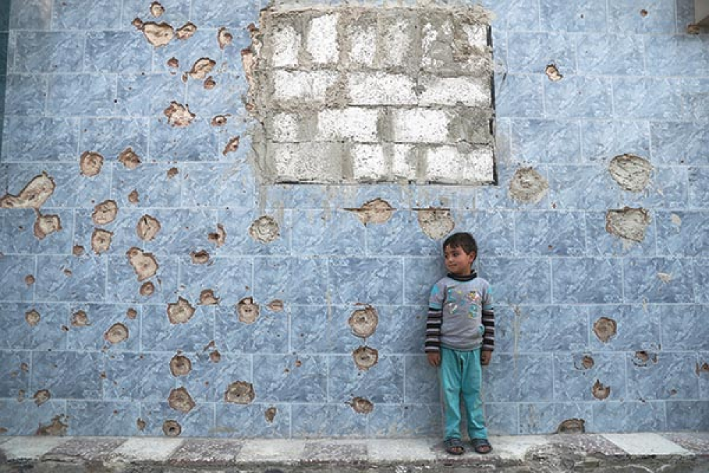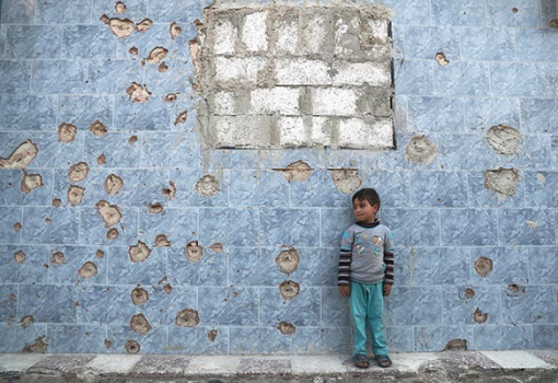 Célkeresztben. Kisfiú áll egy golyók szaggatta fal előtt egy damaszkuszi külvárosban, a lázadók által felügyelt Doumában.