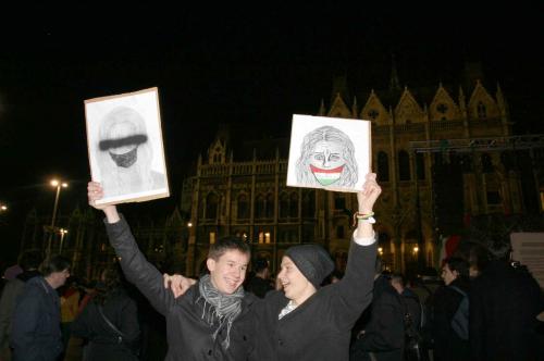 Negyed hatkor a Kossuth téren nincs túl nagy tömeg, inkább csak a középen felállított színpad, az időponthoz képest szokatlanul nagy létszámú, csoportokban álldogáló nyugdíjasok és a pereces stand mutatja, hogy valami készülődik. Aztán egyszer csak a metróból és a környező utcákból áradni kezdenek az emberek, háromnegyedre már a járda szélére szorulunk. Néhány perccel a kezdés előtt az esemény leginkább fesztiválhangulatot idéz, a fiatalok cirkulálnak, az idősebbek álldogálnak. Senki sem taszigál senkit, csak a hátsó traktusból csendülnek izgatott szavak („Nem fogunk hallani semmit! Hallod, Anyukám?” „Akkor menj előbbre!”), ritmusos zene szól. Végül mi is beékelődünk egy micisapkás, a mai ÉS-t szorongató bácsi és egy gyerekét a hátára kötöző fiatal pár közé. Vidámság és jó hangulat uralkodik, nem valószínű, hogy bárki fel akarná szedni a kettes villamos alól a síneket. Aztán Bakács Tibor belecsap a lecsóba, „de jó, hogy itt vagytok, sziasztok!” Egy egység jobb, mint a kétharmad, ne legyünk zombik, álljunk ki az igazunkért. Nem ragozza túl, inkább átadja a szót Fölkel Róbertnek, a tüntetés szervezőjének, aki megköszöni a civileknek, hogy eljöttek, majd megtapsoltatja a bécsi, prágai és pécsi tüntetőket, akik szintén a magyar médiatörvény ellen tiltakoztak. Feje fölött leng az Uniós zászló, de a Parlament ablakai sötétek. Hallassuk a hangunkat, mert látják ugyan, hogy itt vagyunk, de jobb lenne, ha hallanák is, mondjátok mind, hogy „Itt vagyunk!” És szuperek is vagyunk – mondja Fölkel, majd Bakács felkonferálja az este első fellépőjét. Busa Pista, aki jól megmondja a magunkét. Ezen a ponton azért érzékelhető némi generációs szakadék, a micisapkás bácsi kérdőn pislog körbe, az előttünk álló néniken sem uralkodik el a táncolhatnék („Marikám, te érted, hogy mit mond?”), odébb viszont a fiatalság kurjongat és ugrál. Három szám, személyes élmények alapján, majd kifogy a zenei alap, vége a dalnak. Ekkor lép a színpadra Gryllus Dorka személyében a minden forradalomhoz szükséges Gyönyörű Nő, akinek szájából az igazság tiszta hangja tör elő, igaz, kissé bizonytalanul. A Kiáltvány felolvasása után az impozáns méretű papírra vetett szöveg felszögelődik a színpad hátuljára, nem hiába, az igazán fontos dolgokat ki/ le kell szögezni, hogy mindenki olvashassa, akár lassan, akár gyorsan, kinek mire van igénye a befogadáshoz. Ismét Bakács lép a színpadra, az este legfontosabb momentuma következik. Ha fontos számunkra a sajtószabadság, ne habozzunk, tiltakozzunk. Hallassuk a hangunkat, írjunk levelet. És diktálja a címet. „Orbán Viktor, kukac. Ne röhögjél, tényleg! Mondom akkor: orbánviktor-kukac-orbánviktor-pont-hu, végülis magyarok vagyunk, nem?” A lényeg, hogy minél többen küldjük, hátha összeomlik a szervere. Az internetes generáció destruktív tiltakozási formája ez, nemhiába, változnak az idők. Ezután a rózsás forradalmi szekció lép színpadra, Bródy János személyében, nagy taps fogadja. „Negyven éve is be voltam rekedve, most is be vagyok.” Látjátok, nem változik semmi, akkor is volt nép, akkor is volt sajtó, akkor is volt elnyomó hatalom. Igen, így igaz, bólogat a tömeg. „Negyven éve is berekesztettek” – kuncogás hallatszik mindenfelől, és felcsendül a „Ha én rózsa volnék” című, jelenleg ismét fájdalmasan aktuális dal, könnynek gyűlnek a szemekbe. Majd pedig, az „Azt hiszed, hogy nyílik még a sárga rózsa” kezdetű, örökbecsű darab következik, ez is nagyon aktuális, mert inkább a szeretet hatalmáról kellene beszélni, csak ezt néhányan elfelejtették, és inkább a hatalom szeretete látszik rajtuk. De mi ezt nem hagyjuk, ezért vagyunk itt, megmutatjuk nekik. A könnyek közé mosoly is vegyül, Bródy helyenként elvéti a szöveget, nem gond, mi emlékszünk rá, a generációs szakadék ezen a ponton végleg eltűnik. Végül ismét Bakács penderül a színpadra, most kapta a hírt, tízezren vagyunk, on-line is vagy ötezren követték az eseményt. „Nem semmi, ügyesek vagytok! Béke és szeretet, most pedig mutassuk meg, hogy mi tudunk rendesen tüntetni, rendesen viselkedni. Köszi, hogy itt voltatok, hamarosan újra találkozunk. És most kulturált sorokban irány a metró!”