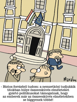 – Biztos forrásból tudom: a nemzetközi tudjukkik titokban hülye összeesküvés-elméleteket gyártó politikusokat támogatnak, hogy az emberek már az összeesküvés-elméletekben se higgyenek többé!
