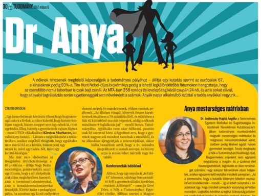 Dr. Jedlovszky Hajdú Angéla a Semmelweis Egyetem Biofizikai és Sugárbiológiai Intézetének Nanokémiai Kutatócsoportjában tudományos munkatársként dolgozik: mesterséges mátrixokat és mágneses nanorészecskéket kutat, civilben pedig férjével együtt három gyermeket nevelget. Tavaly megkapta a Nők a Tudományban Kiválósági díjat.