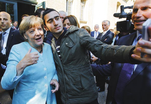 #MamaMerkel – Angela Merkellel szelfizik egy menekült. Noha a német befogadási kultúrára építve hozta meg a döntéseit, a menekültek lassan védőszentjükké emelik a kancellárt. Ez látszik akkor, mikor a képét szorongatják ikonként, és akkor is, mikor gyermeküket nevezik el róla, mint tette augusztusban egy ghánai asszony, aki a kormányfő iránti hálája jeléül Angela Merkel Adének keresztelte újszülött kislányát.