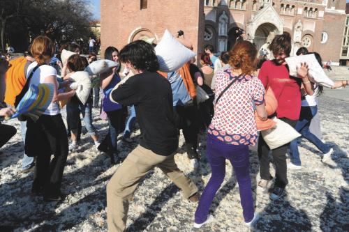 A IV. Nemzetközi Párnacsata Napján, amit a Negyedik Köztársaság Y generációs mozgalom szervezett, mindössze három szabály volt: puha párnát kellett hozni, ütni csak párnás embert lehetett, és szigorúan szemüveg nélkül kellett játszani. Budapest mellett számos vidéki város: Dunaújváros, Debrecen, Győr, Kecskemét, Pécs, Salgótarján, Szeged (képünkön), Szekszárd, Székesfehérvár és Szombathely is csatlakozott a programhoz.