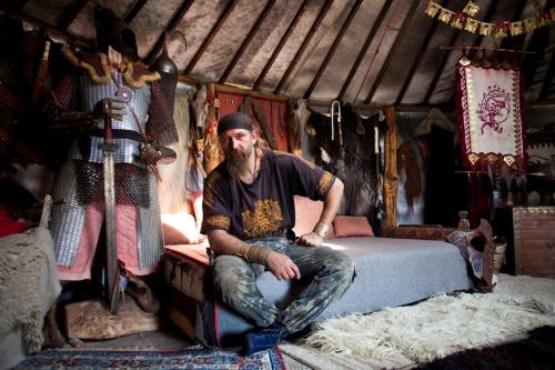 Aztán elérünk a jurtához, amiben azelőtt éltek, míg el nem készült a vaskori ház. Bent szőnyegek, fegyverek, ruhák és csergetakaróval fedett ágy. Középen Kuber, a talpig páncélba öltöztetett tartóállvány áll, így őrzi Új-Szkítia törzsi zászlaját. Én meg a lélekjelenlétemet, mikor a birodalom ura a paleoszibériai jurta ajtaja melletti rönkön pipára gyújtana, de kiderül: életlen a kova, amivel tüzet csiholna. Felkap hát a sarokból egy marhalábszárcsontot, és addig püföli a követ, míg le nem pattan róla egy éles darab, s már meg is van a szikra.