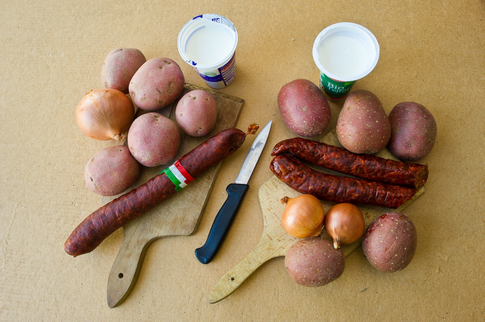 A nagy bevásárlás után otthon ért a következő meglepetés. Némi gyanakvással kóstoltuk meg a bio mangalicakolbászt, ám az első katona után kiderült, remek alapanyaggal fogunk dolgozni. Hasonló élményünk volt a mangalicaszalonnával is, amit zsírjára pirítottunk, és kenyérrel faltunk be – jóízűen. Az alapanyagok tehát rendben voltak. A krumpliról már szóltam, abból szebb volt a biováltozat, a hagymára sem lehetett panasz, irdatlanul csípte a szemem.