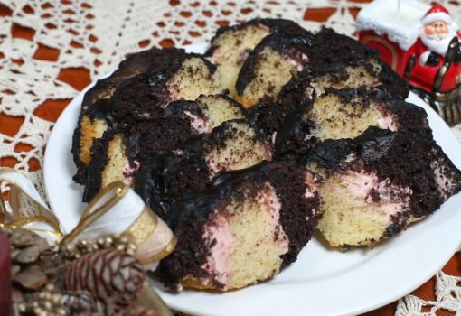 Recept: A piskótához először 1 csomag sütőporral elkeverünk 27 dkg lisztet, 27 dkg cukrot, 4 tojást, ezután belecsorgatunk 1 dl olajat, végül 1 dl meleg vizet. Ha sikerült szépen összedolgozni, kettéosztjuk. Az egyik fele marad világos piskótatészta (ez legyen egy picivel több), a másik feléhez adjunk 2-3 evőkanál jó minőségű kakaóport, és keverjük el. Előkészített (olajjal picit kikenjük és megszórjuk morzsával) őzgerincformába öntjük a tésztákat, és 180 fokra előmelegített sütőben 20-25 perc alatt egyszerre megsütjük őket. Közben elkészítjük a krémet: egy zacskó főzős puncspudingot 2,5 dl tejjel (cukor nélkül) megfőzünk, majd teljesen kihűtjük. Összedolgozunk 20 dkg margarint 20 dkg porcukorral és ha kihűlt a puncsos alap, botmixer segítségével belekeverjük a cukros vajba. Ha a piskóta megsült, az őzgerincforma gerezdjeinek megfelelően felszeleteljük, majd megtöltjük a krémmel a következő sorrendben: barna piskóta, puncskrém, sárga piskóta, puncskrém, barna piskóta – amíg tartanak a hozzávalók a két rúd süteményhez. A végén leöntjük a csokibevonattal, erre mindenkinek saját receptje van, én érzésre melegítem össze a tűz fölött a kakaóport, a cukrot és a vajat. Legalább egy éjszakát hűlnie kell. A süteményt ferdén kell felszeletelni, mert így szépen látszanak majd a különböző színű rétegek.
