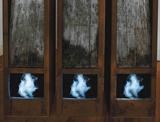 A zenét direkt az alkotáshoz írta Michael Nyman. Odébb barna, fa gyóntatószék lóg, szintén megfordítva, szinte vészjóslón lebeg, ablakában tűz lobog, halljuk is a ropogást. Majd lávafolyamhoz érkezünk: kövek lukas közepében szintén ég a tűz. Persze videotechnika által. Aztán megint a vízé a főszerep: két elektronikus, végtelenített vízesés zubog, a következő teremben pedig már mennydörgés zeng és kék villámok cikáznak egy tévészerű dobozban, felette régi ajtókba csapódott balták.