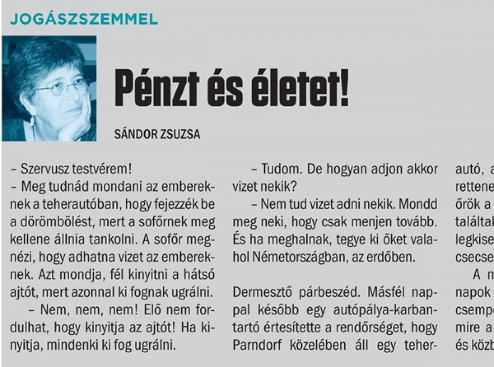 – Meg tudnád mondani az embereknek a teherautóban, hogy fejezzék be a dörömbölést, mert a sofőrnek meg kellene állnia tankolni. A sofőr megnézi, hogy adhatna vizet az embereknek. Azt mondja, fél kinyitni a hátsó ajtót, mert azonnal ki fognak ugrálni.