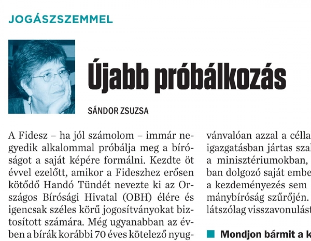 A Fidesz – ha jól számolom – immár negyedik alkalommal próbálja meg a bíróságot a saját képére formálni. Kezdte öt évvel ezelőtt, amikor a Fideszhez erősen kötődő Handó Tündét nevezte ki az Országos Bírósági Hivatal (OBH) élére és igencsak széles körű jogosítványokat biztosított számára. Még ugyanabban az évben a bírák korábbi 70 éves kötelező nyugdíjkorhatárát egyik percről a másikra 62 évre szállította le és egy év alatt 200 bírótól szabadult meg. Ez a két akció csak részben lett sikeres, a bírák elbocsátását mind az Európai Bíróság, mind az Alkotmánybíróság Alaptörvény-ellenesnek ítélte, ezért azon módosítani kellett. Handó hatáskörét is kénytelenek voltak szűkíteni, megszüntetve az ügyek áthelyezésének önkényes lehetőségét.